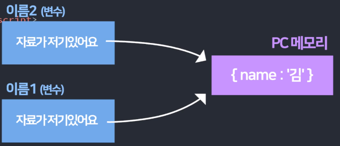 var 이름1 = {name:'Kim'} var 이름2 = 이름1; 이름1.name = '박';이렇게 적으면 이름1은 박으로 변경이 되는데, primitive에선 이름2는 그대로 킴인데, reference에선 이름2도 박으로 바뀐다. 즉, 이름1에 김이 저장되는게 아니라 자료가 저기 있어요 라고 화살표가 할당되었기 때문이다.